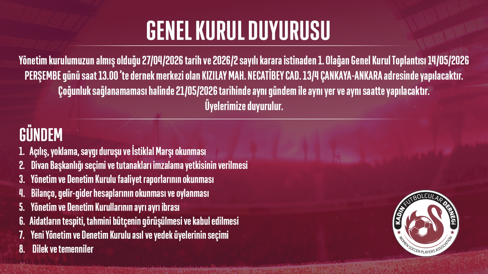 Sporun gücüyle birleşip, kadın futbolunu desteklemek amacıyla kurduğumuz derneğimizin başkanı olarak sizlere seslenmek istiyorum. Derneğimiz, kadın futbolcuların haklarını savunmayı, onları güçlendirmeyi ve kadın futbolunu daha geniş kitlelere tanıtmayı hedeflemektedir.